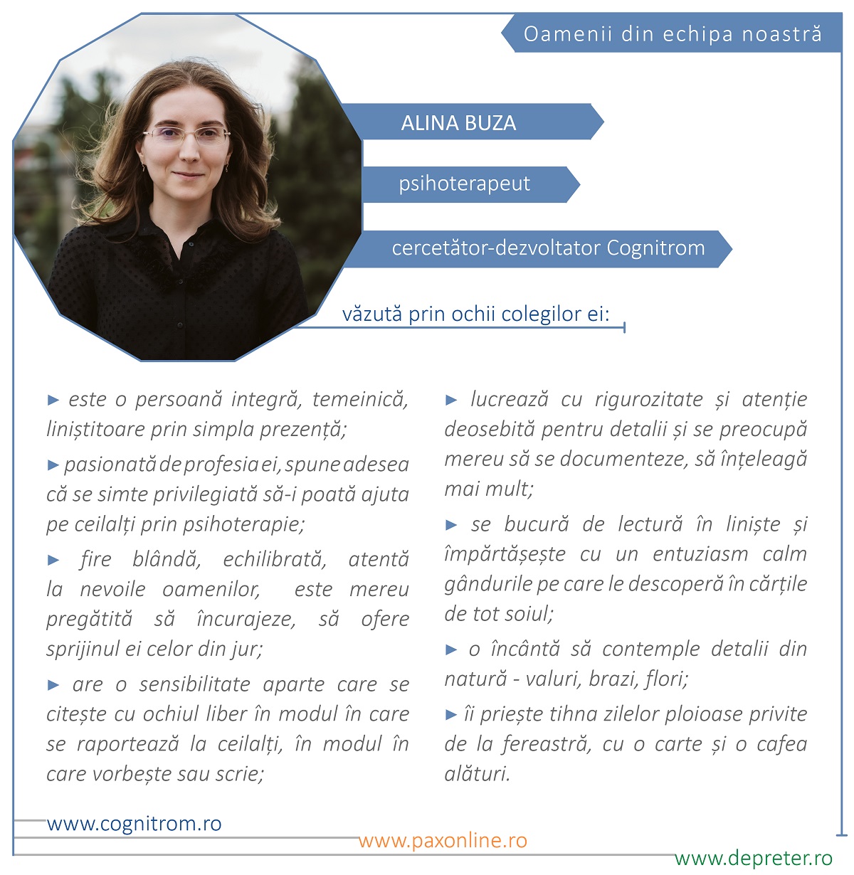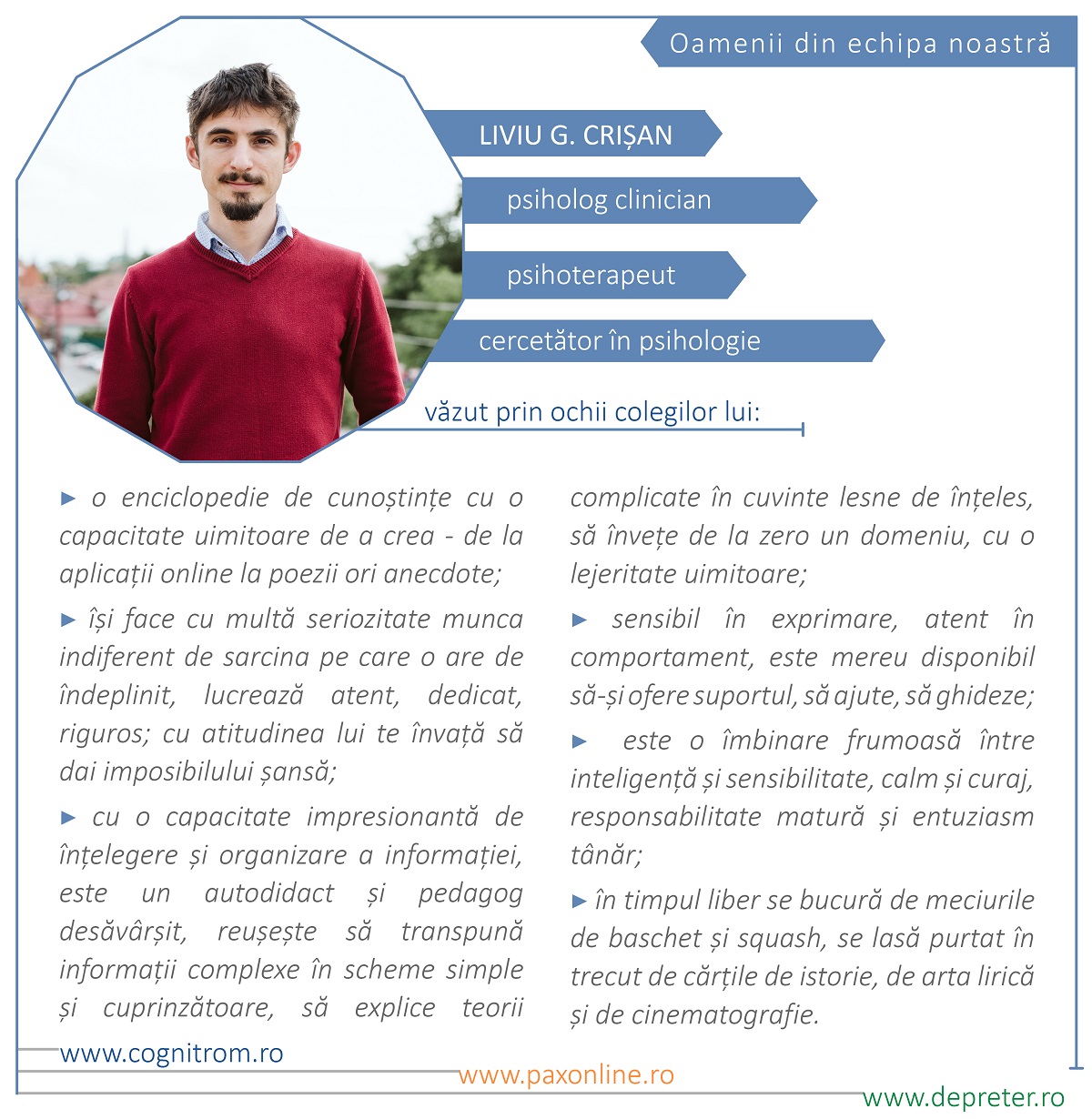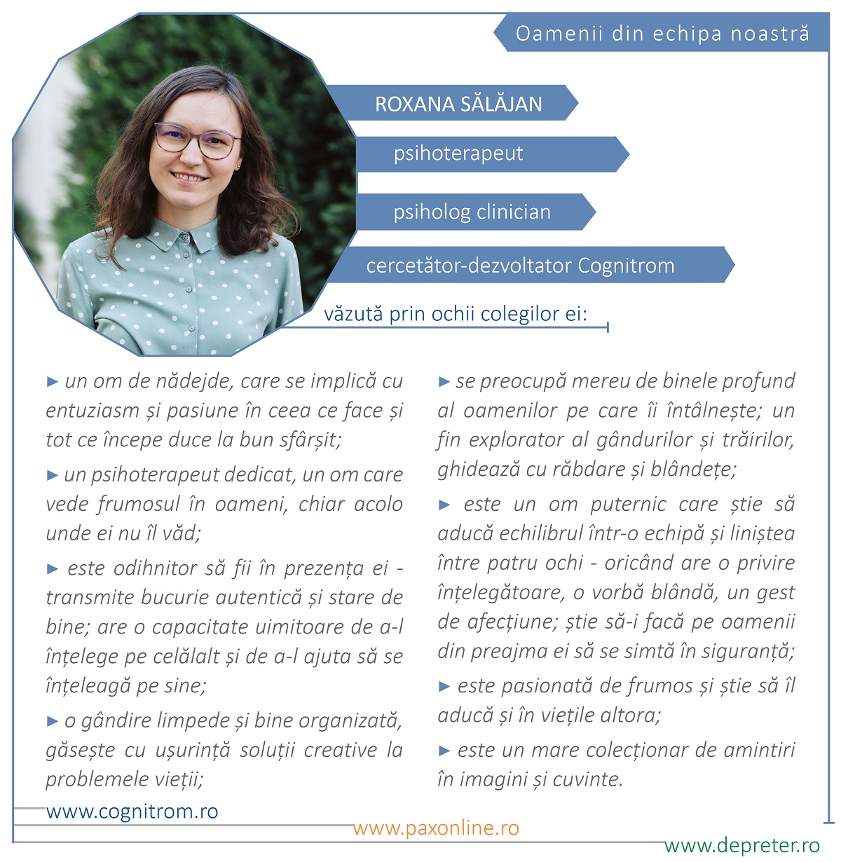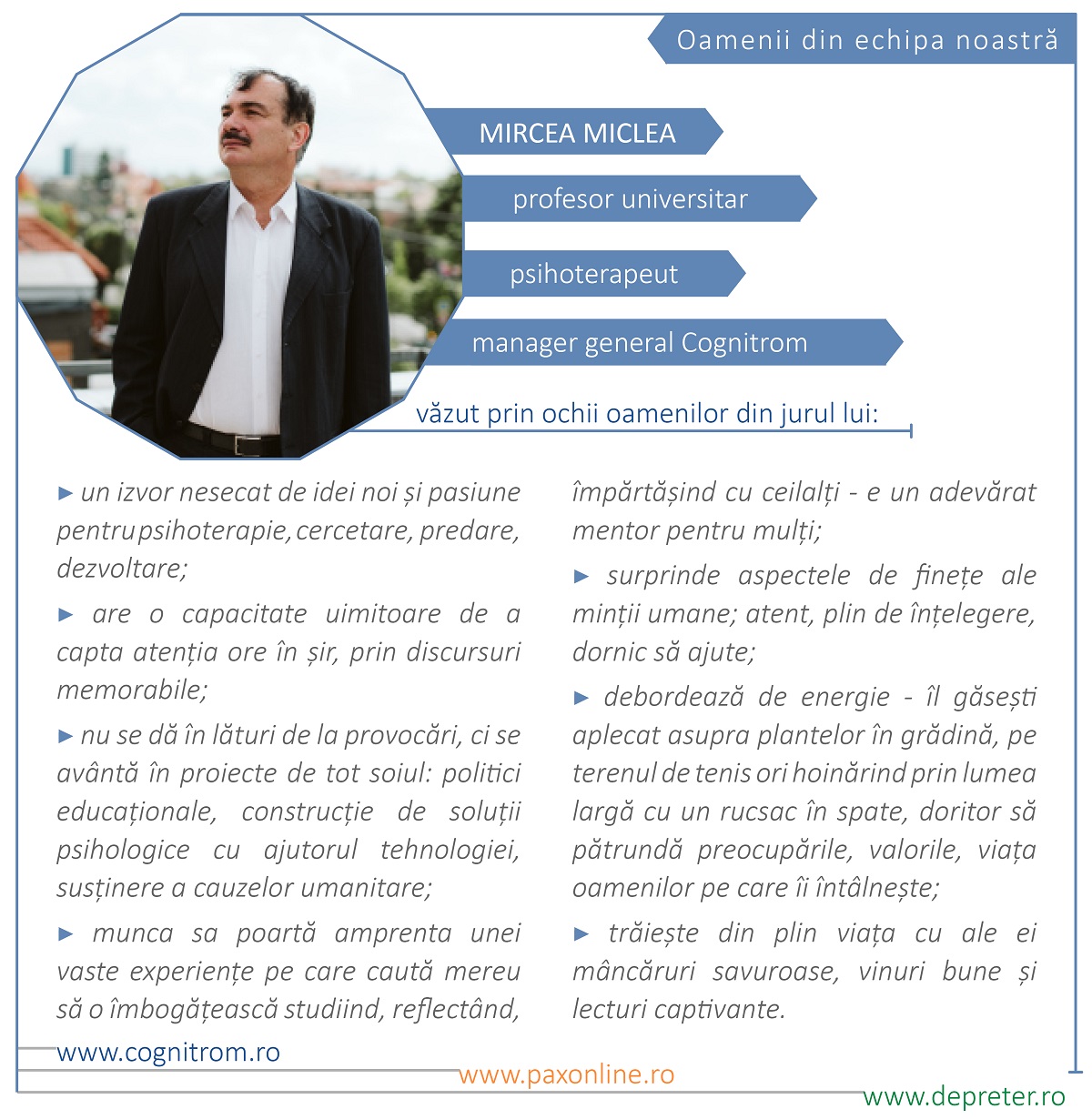 Centrul de Psihoterapie Cognitrom (CPC) reunește specialiști în psihologie clinică, neuroștiințe cognitive, psihoterapie cognitiv-comportamentală și IT cu experiență în evaluarea avansată a tulburărilor emoționale și în utilizarea intervențiilor psihologice adecvate pentru tratarea acestor probleme. Specialiștii CPC își desfășoară activitatea cu clienții la sediul din Cluj-Napoca sau online prin intermediul DEPRETER și PAXonline, cele mai avansate platforme de psihoterapie pentru depresie și anxietate.